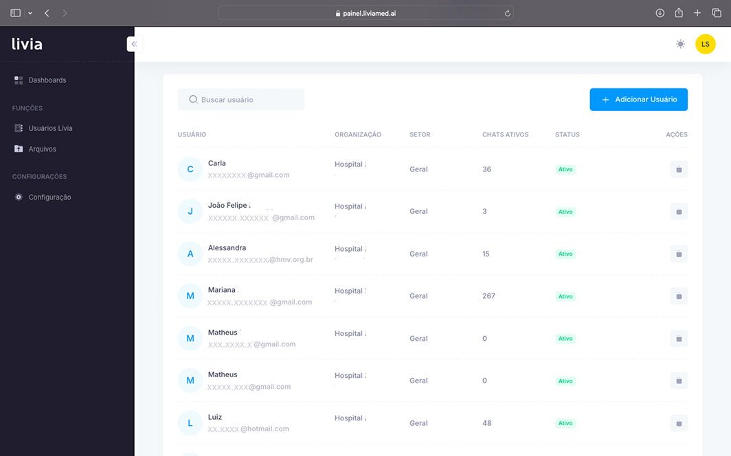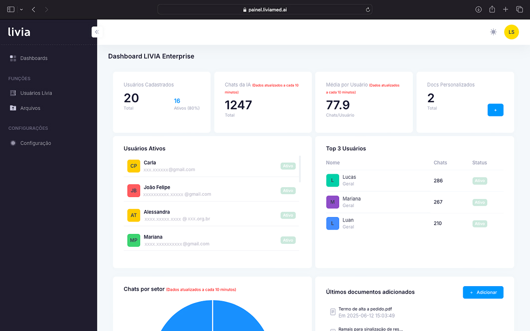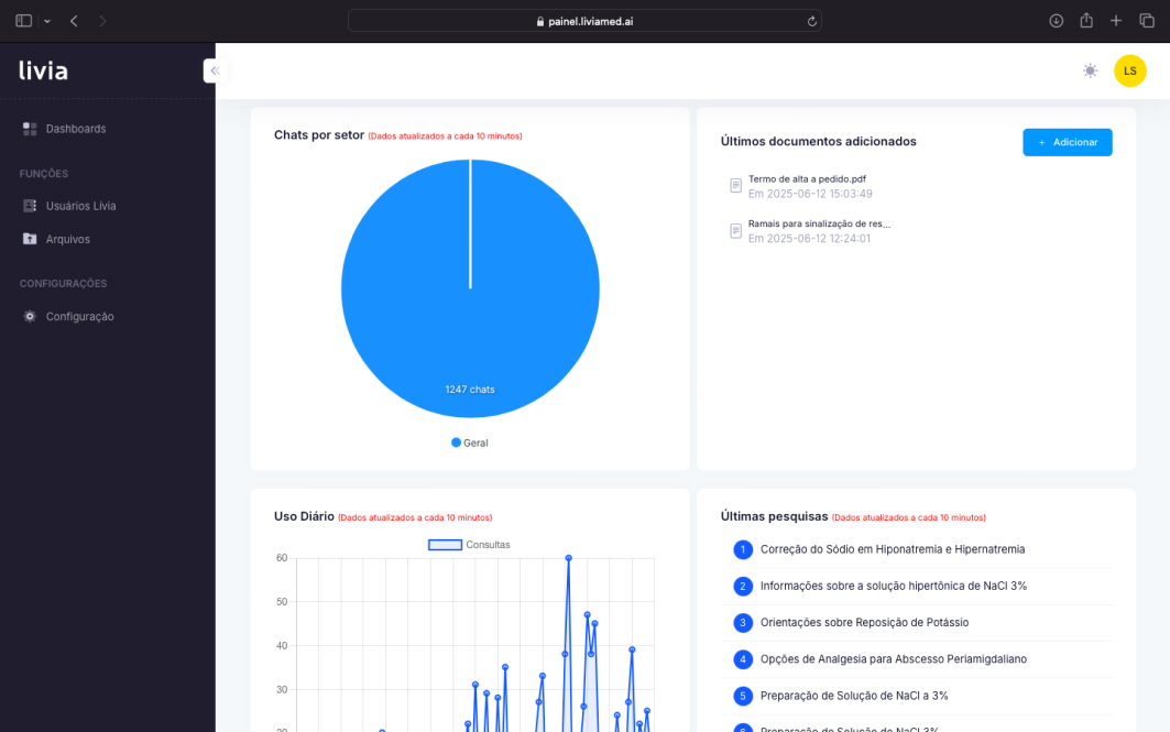 Somente o(s) usuário(s) gestor(es) da Instituição possui (em) acesso aos dados acumulados e/ou anonimizados de dúvidas, mensagens trocadas e prompts realizados. Com relação aos dados sensíveis, que envolvem o completo teor das mensagens trocadas com a Livia, as informações de pacientes e médicos e demais dados com essa particularidade permanecem sem acesso – salvo casos autorizados – em conformidade com o que manda a LGPD .