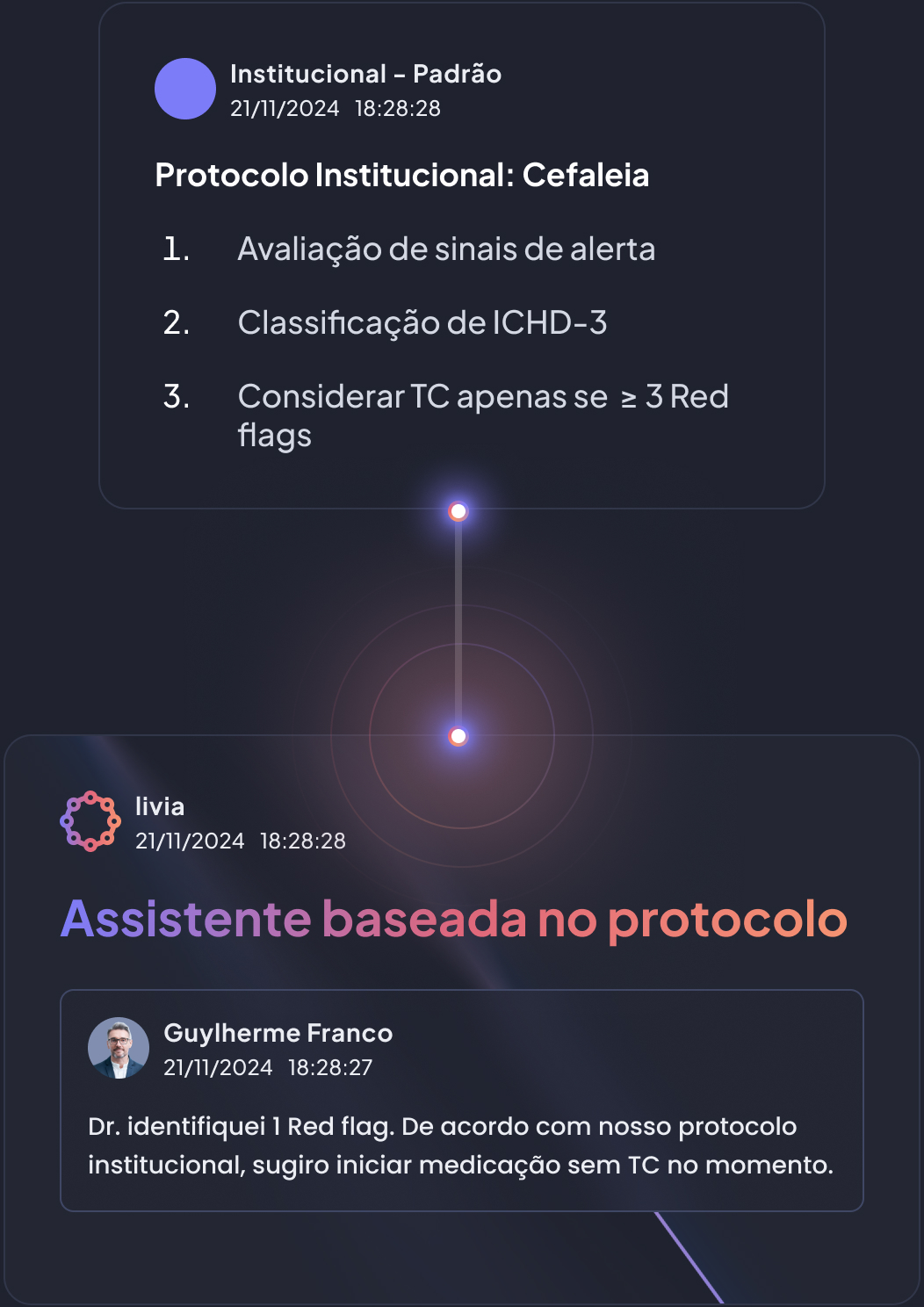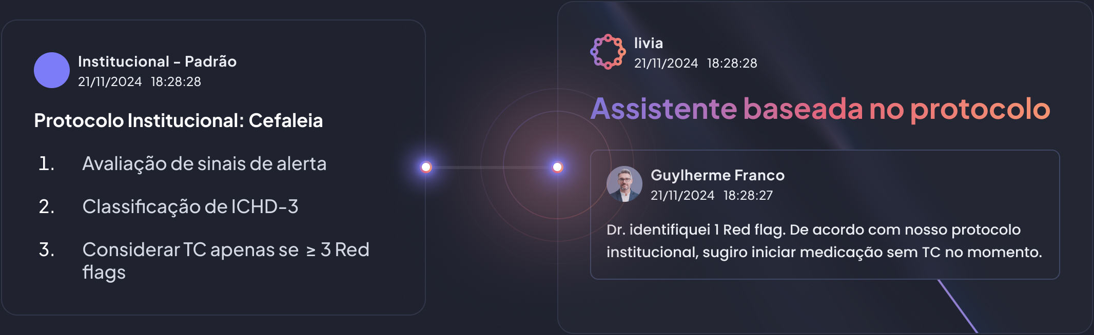 A Lívia possui protocolos nativos na sua base que estão de acordo com as principais diretrizes médicas nacionais e internacionais, o que garante a sua acurácia e segurança. No entanto, é possível que a sua Instituição possua protocolos próprios que incluam mais passos/exames/obrigatoriedades para determinados casos; dessa forma, adaptamos a Livia para que ela responda aos questionamentos relacionados com esses tópicos de forma a atender os protocolos próprios, incluindo essas informações e documentos na base de dados da Livia.